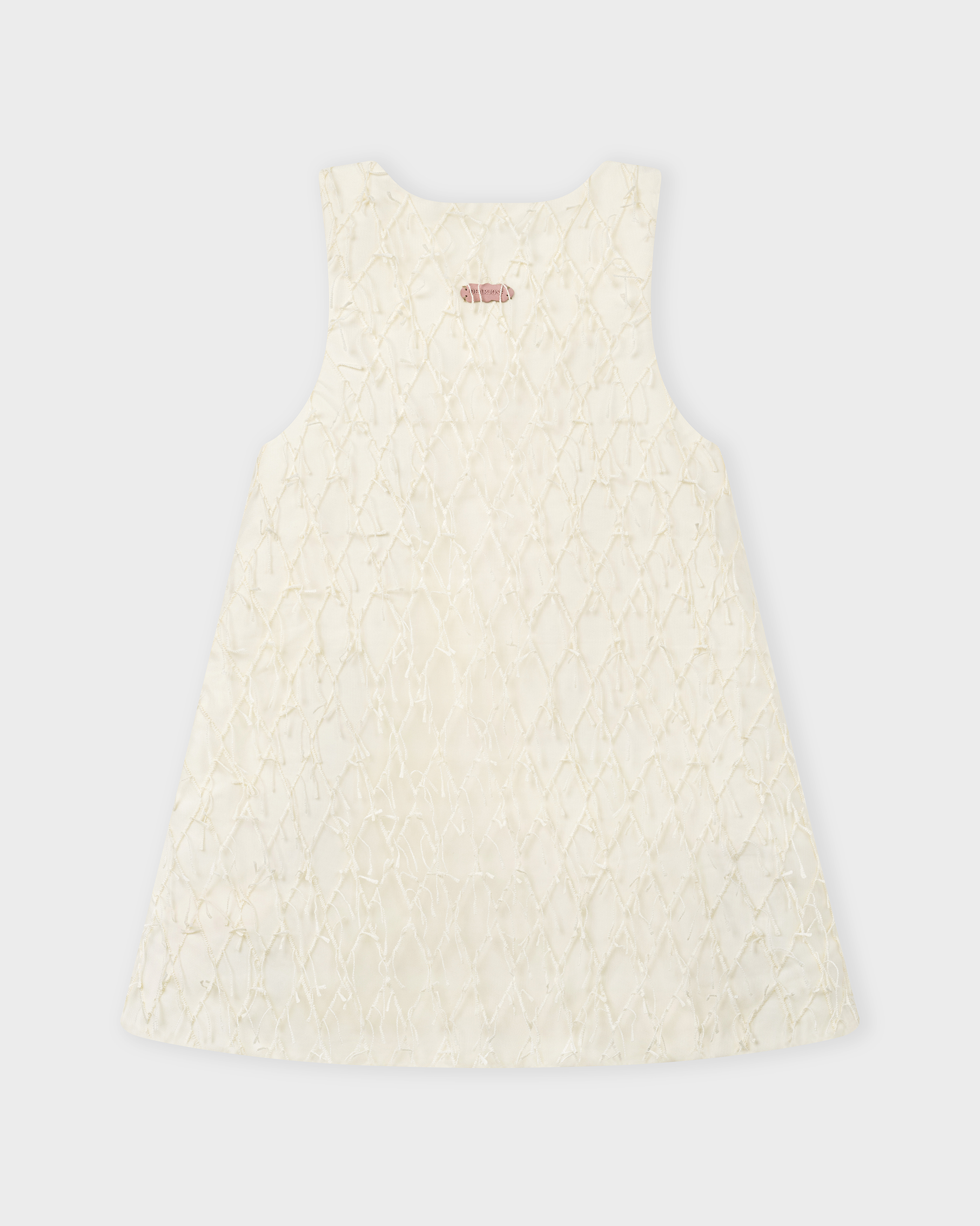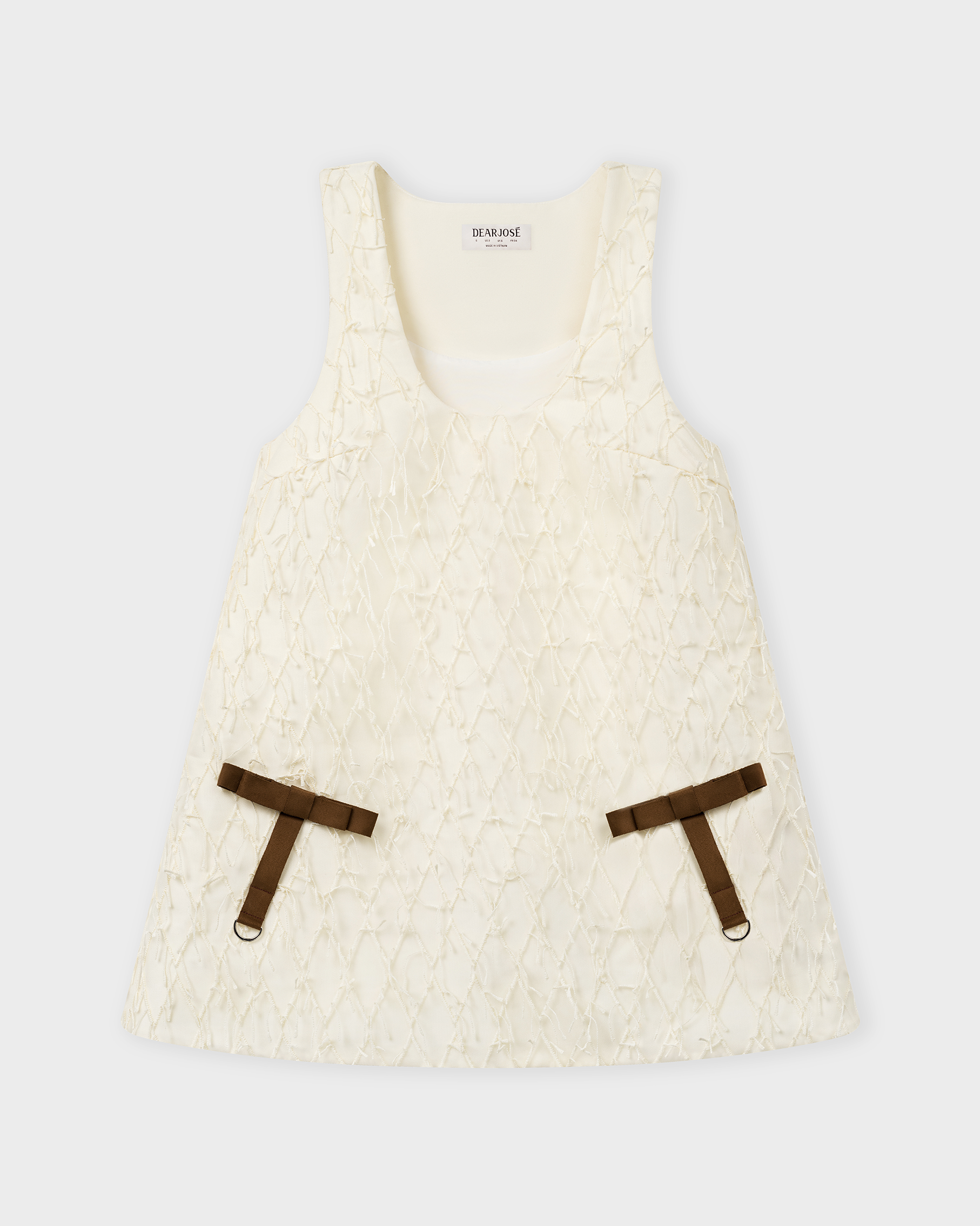 A chic mini shift dress crafted from premium textured poly with embroidered fringe detailing, offering an elegant yet youthful look. The relaxed A-line silhouette flatters the figure while ensuring comfort and ease of movement. Faux suede bow details on the front pockets add a playful yet refined touch to the minimalist design.