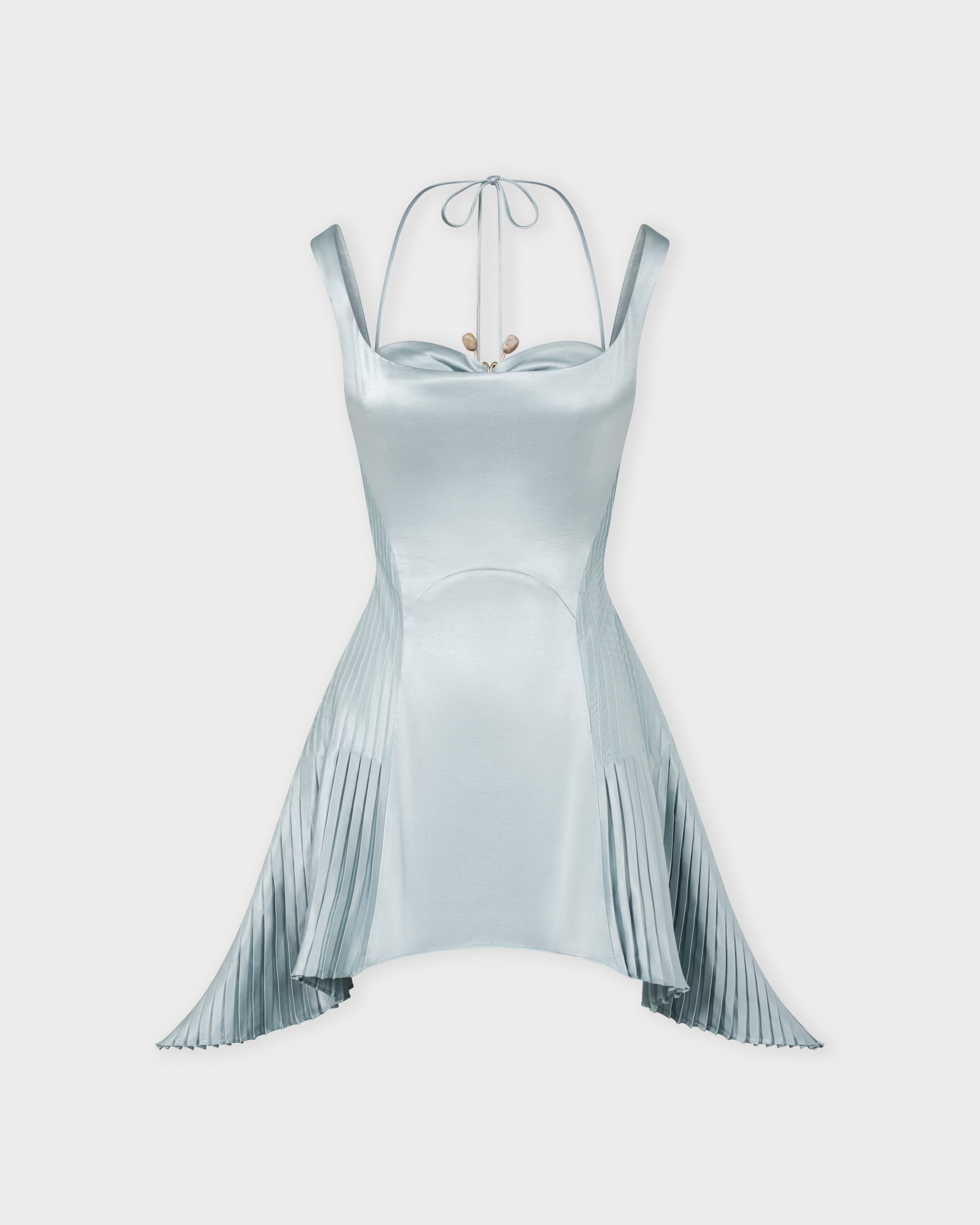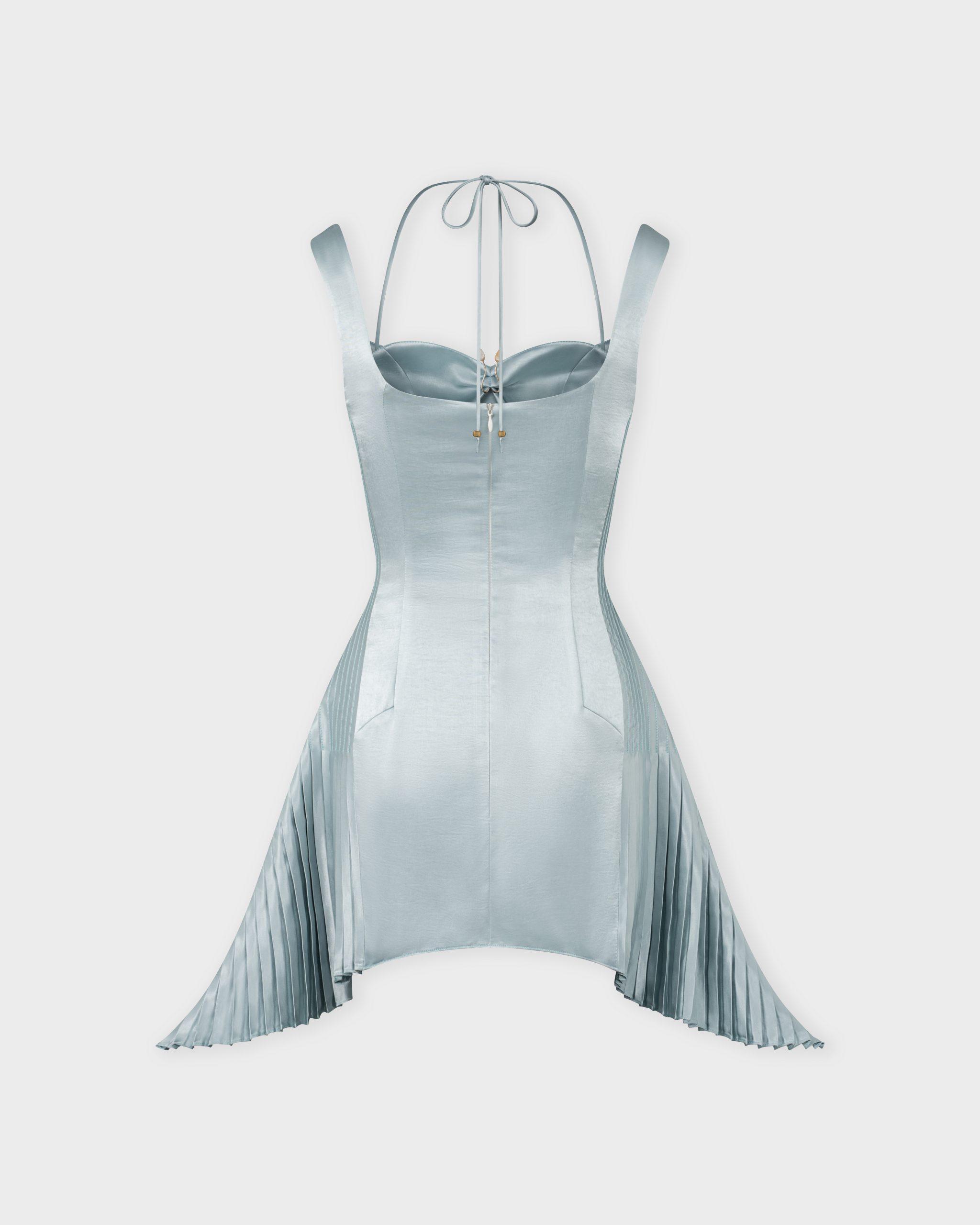 A sculptural mini dress designed to make an entrance. Crafted from a sleek, metallic satin-like fabric with a soft reflective sheen, this dress contours the body while incorporating dynamic pleated panels that create movement with every step.