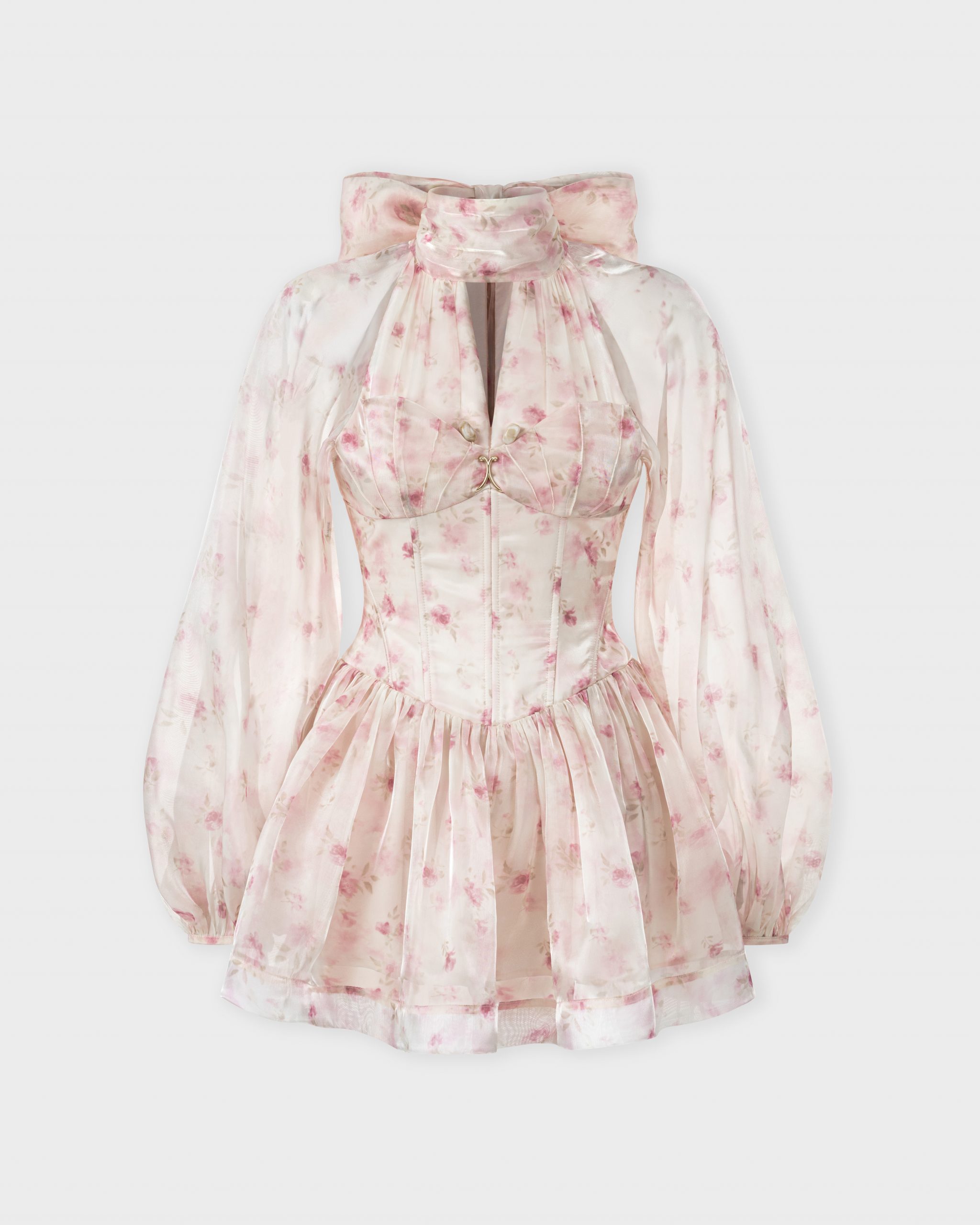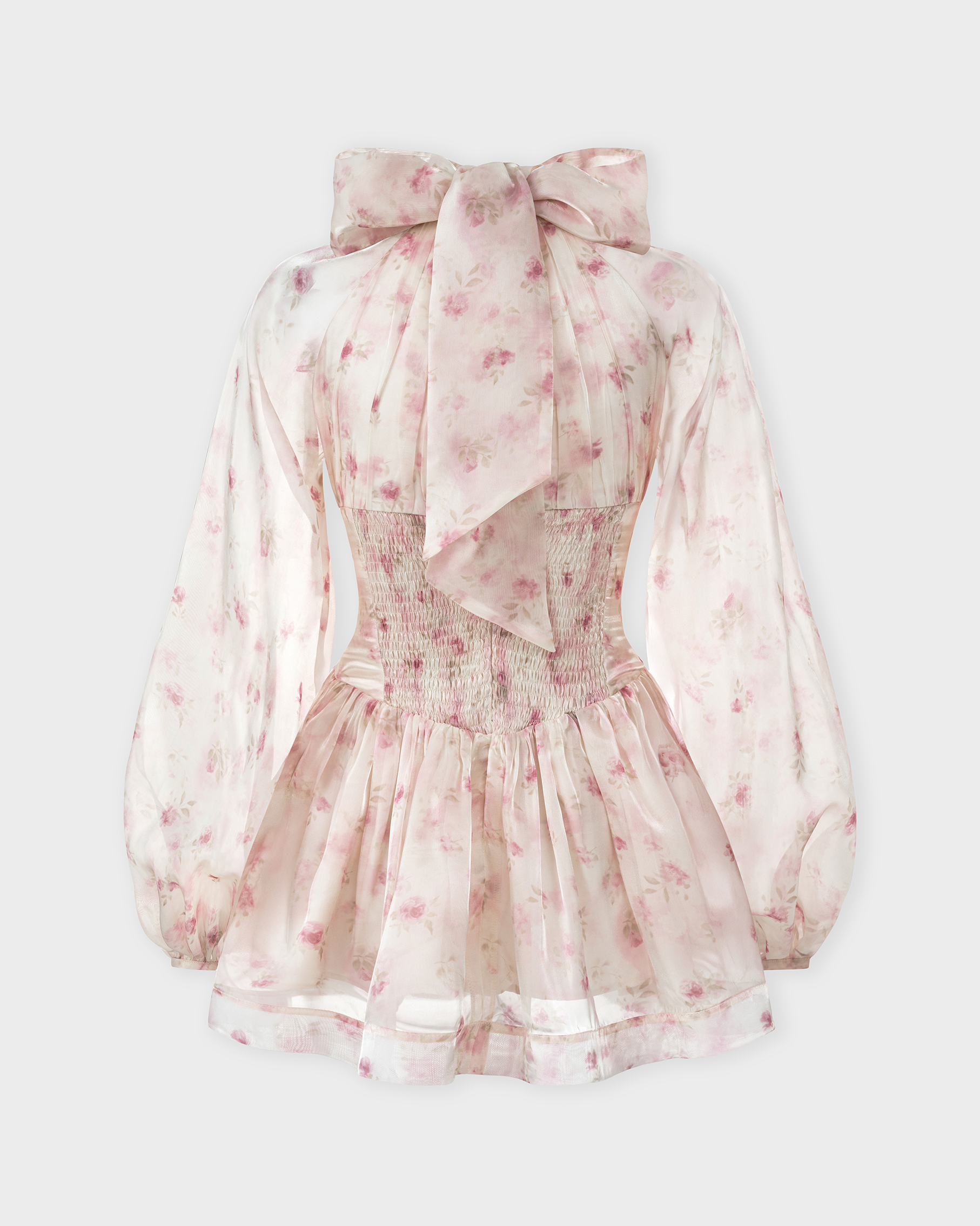 This mini dress is designed with a statement high neckline and oversized bow, balanced by a keyhole cut-out for visual interest. The structured bodice shapes the upper body, while voluminous sleeves and a gathered skirt create contrast and movement. A defined waist enhances the silhouette, resulting in a refined yet playful design suitable for both daytime and elevated occasions.