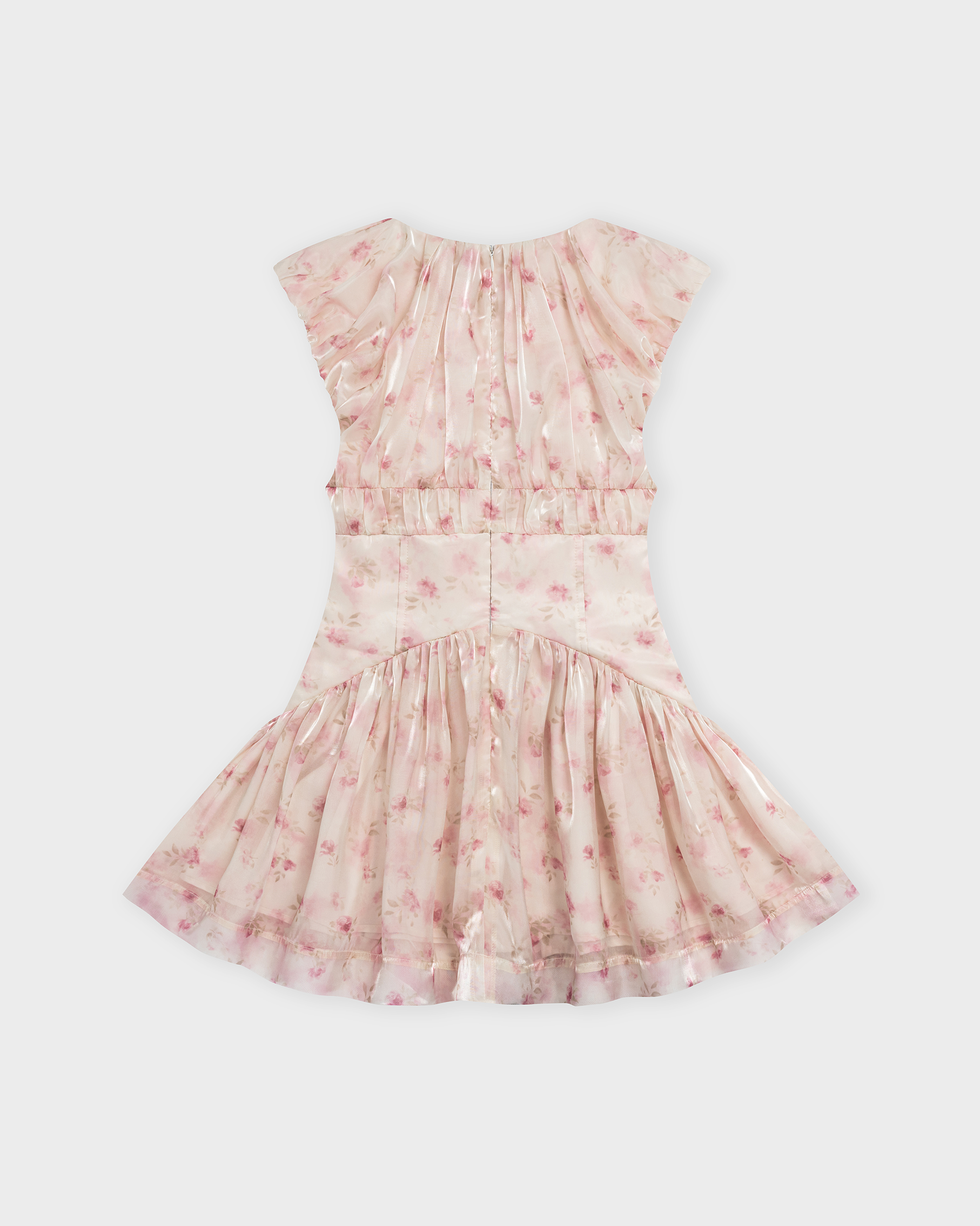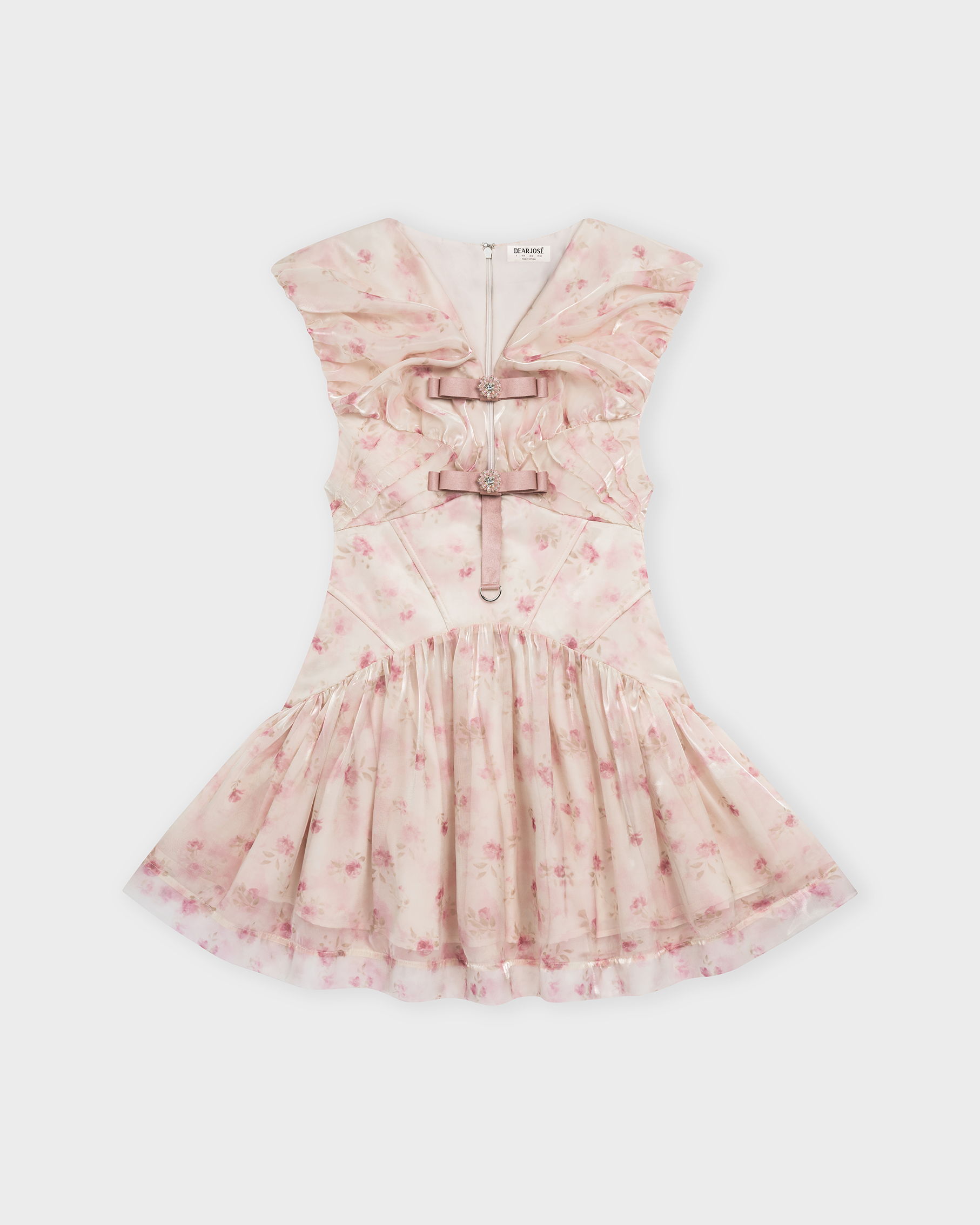 This dress highlights a youthful yet refined silhouette with a structured bodice and a softly flared skirt that creates playful movement. The bow detail at the front adds a feminine focal point, while the lightweight fabric and subtle pleating enhance comfort and elegance. Perfect for daytime events or styled occasions with a modern romantic touch.