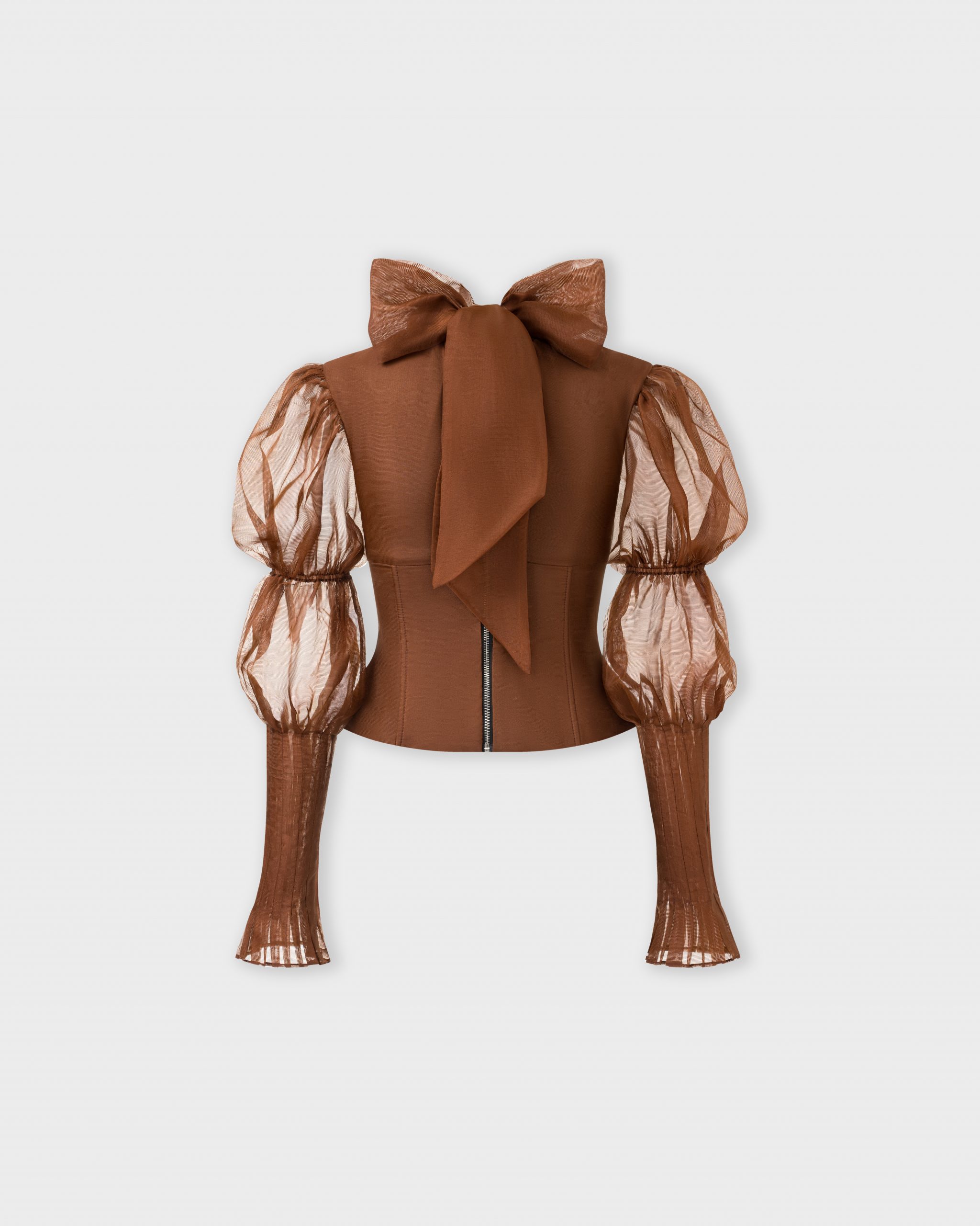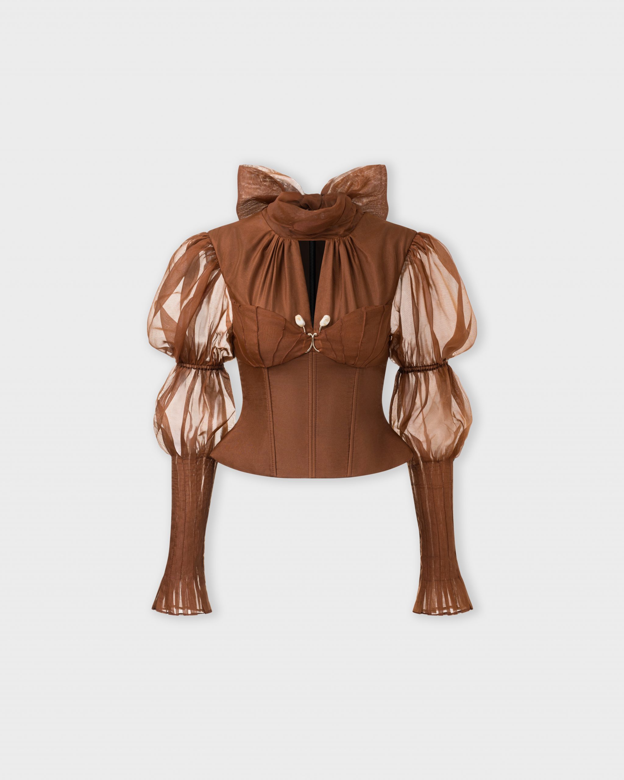 This striking corset-style blouse is crafted from lightweight sheer organza, blending romantic volume with a structured silhouette. The rich amber-brown tone brings warmth and sophistication, while the dramatic puff sleeves add a touch of modern femininity.